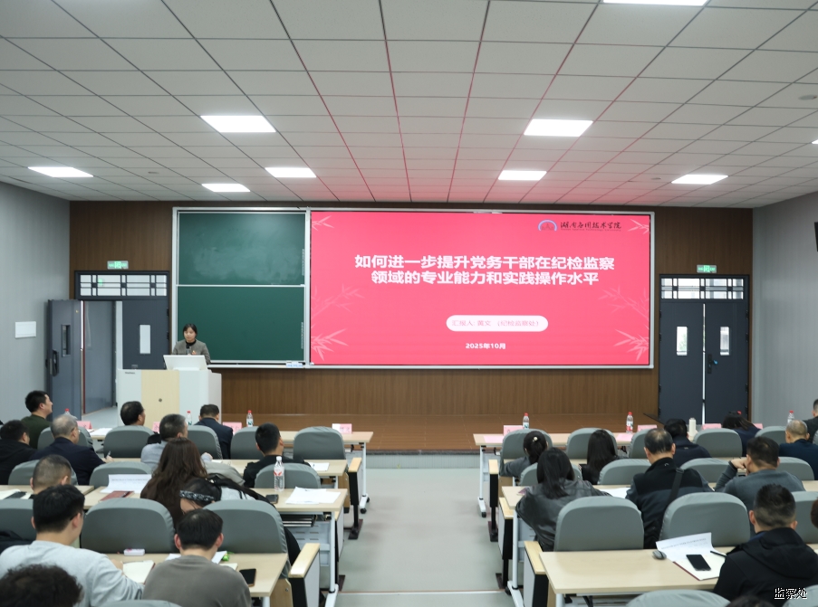 学校纪委副书记、监察处处长黄文以《如何进一步提升党务干部在纪检监察领域的专业能力和实操能力》为题,围绕规范工作流程、精准运用监督执纪“四种形态”及加强警示教育三个方面作专题学习辅导。她强调,纪检监察工作要聚焦“三重一大”监督,规范监督执纪流程,并精研谈话技巧。通过剖析近年来师德失范典型案例,以案明纪,警示全体党务干部引以为戒,自觉树立良好家风与作风,筑牢廉洁防线。